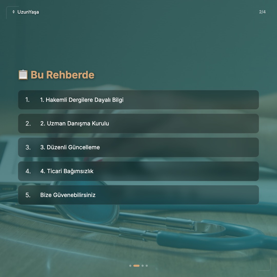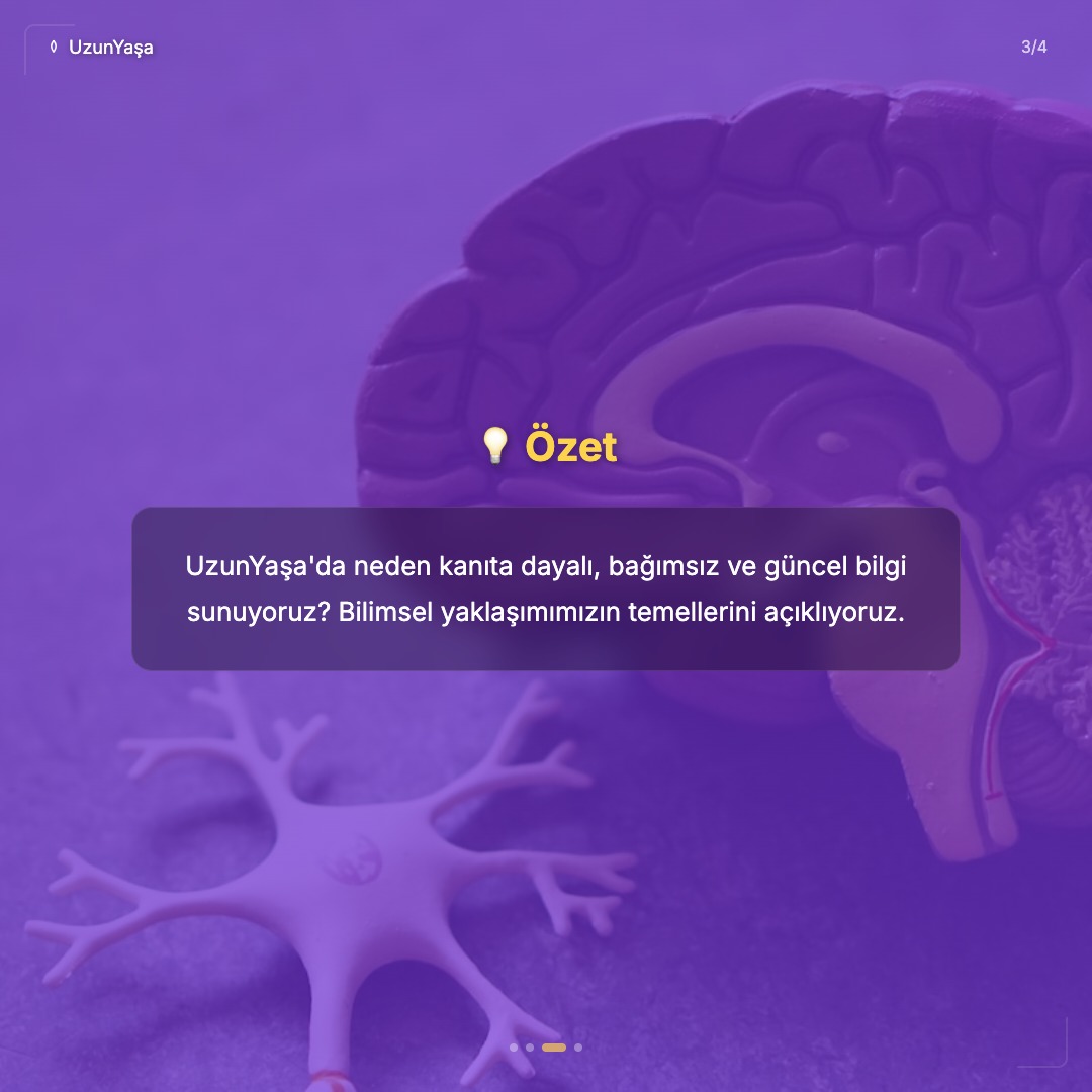 UzunYaşa olarak biz bu kaosu düzenlemeye, güvenilir ve anlaşılır sağlık bilgisini herkes için erişilebilir kılmaya karar verdik. İşte bizi farklı kılan ilkeler: