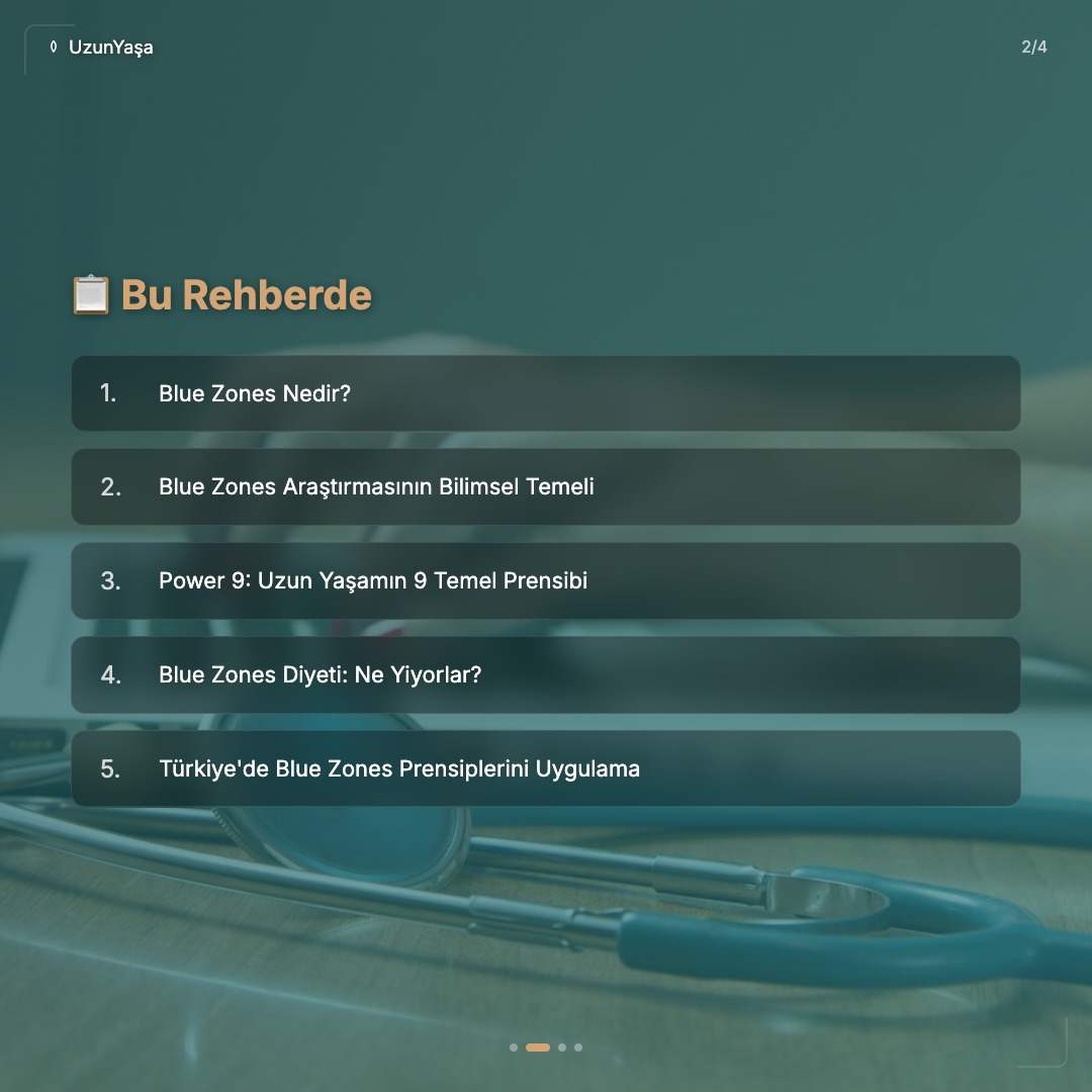 Dünyada bazı bölgeler var ki, insanlar burada olağanüstü uzun ve sağlıklı yaşıyorlar. National Geographic Explorer Dan Buettner ve araştırma ekibinin yaptığı çalışmalar sonucu "Blue Zones" (Mavi Bölgeler) olarak adlandırılan bu yerler, uzun yaşamın sırlarını barındırıyor.